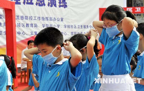 2009年7月6日,湖北宜昌举行暑期甲型H1N1流感防控应急演练。图为宜昌市学院街小学的学生在演练中戴口罩。 新华社发(黄翔 摄)