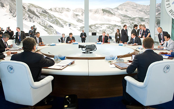 7月8日,在意大利中部城市拉奎拉,与会领导人参加八国集团首脑会议。当日,八国集团首脑会议在拉奎拉开幕。新华社/法新