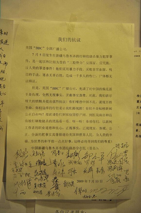 7月13日上午,当记者来到设在乌鲁木齐海德饭店的新闻中心时,这里的工作人员反映说,连日来他们不断接到当地市民打来的电话,反映西方媒体关于“7·5”事件的报道不仅有失公允,而且无视基本事实,他们要求工作人员将他们的不满和抗议转告给相关的西方媒体记者。有些市民更是直接将他们的抗议信送到新闻中心,将其贴在那里。