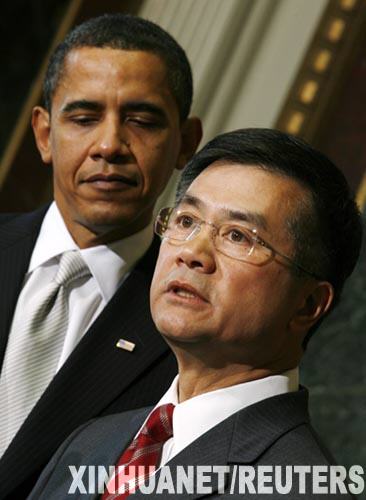 2月25日,美国总统奥巴马(左)在华盛顿白宫的新闻发布会上提名前华盛顿州华裔州长骆家辉(右)为商务部长人选。 新华社/路透