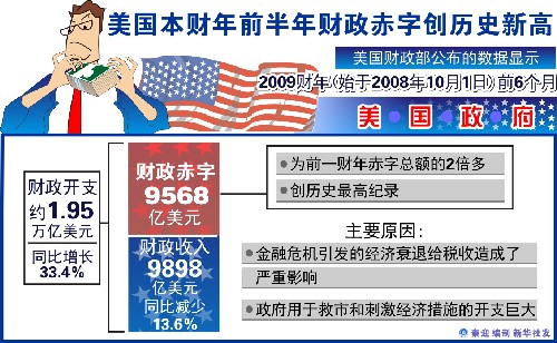 新华网华盛顿7月13日电(记者刘丽娜 刘洪)美国财政部13日公布的数据显示,在截至6月30日的2008-2009财政年度的前9个月,美国联邦财政赤字首次超过1万亿美元。