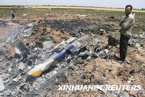 7月15日,在伊朗加兹温附近的坠机现场,一名男子站在飞机残骸旁。据伊朗国家电视台报道,一架由伊朗首都德黑兰飞往亚美尼亚首都埃里温的伊朗客机15日在伊朗西北部城市加兹温附近坠毁,机上168人“很可能”全部遇难。新华社/路透