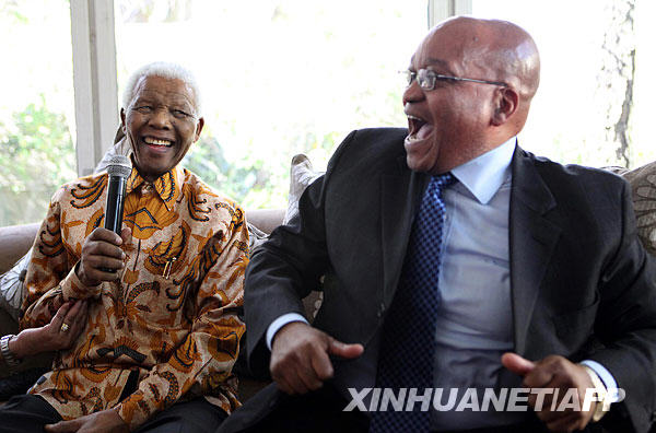 7月18日,南非总统祖马(右)在约翰内斯堡祝贺前总统纳尔逊·曼德拉(左)91岁生日。当天,曼德拉在约翰内斯堡的家中庆祝他91岁生日。新华社/法新