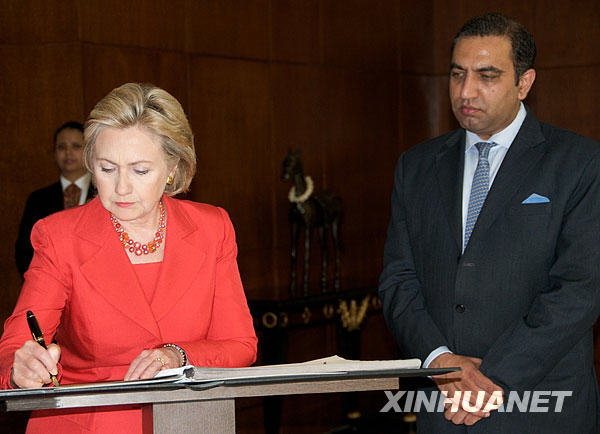 7月18日,在印度孟买的泰姬玛哈酒店,到访的美国国务卿希拉里·克林顿(前左)在留言簿上签名。希拉里于17日晚到达孟买,开始对印度的数天正式访问。这是希拉里就任美国国务卿以来对印度的首次访问。新华社发