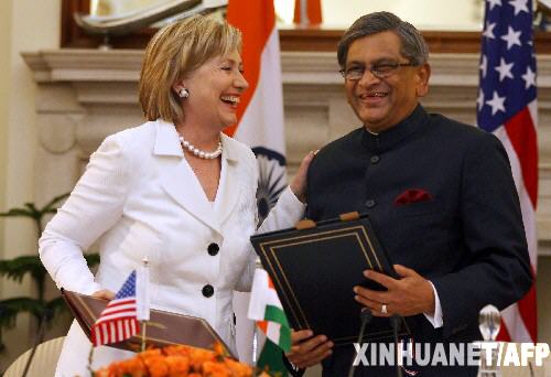 2009年7月21日 印度与美国签署国防等三个合作协议 7月20日,在印度首都新德里,正在印度访问的美国国务卿希拉里·克林顿(左)与印度外长克里希纳出席协议签署仪式。美国与印度当日签署了有关国防、太空和科技合作的三项协议。 新华社/法新