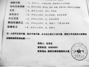 招聘负责人杜先生表示,这段文字是公司老板特地要求加上去的。“以前,公司招聘的不少员工,有的只干了几个月就走了,有的拿到当月工资就不干了,这让公司一下子就陷入用工紧张境地,所以,老板特地嘱咐,以后的招聘信息中,都要增加这样一段话。”
