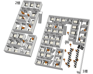 1区、2区、楼1区、楼2区各有22个房间,电线、开关、地板都已经装好;其余四个区域还在建造,各有房间18间;还有两个南北走向的通道,分别在仓库的两端,其中一个通道,一楼、二楼共有房间18间。
