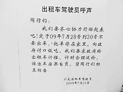 很多出租车司机都收到了这份传单,要求他们在7月28日到30日3天内,“齐心协力行动起来,把车停在家里,不要出车,向政府讨口饭吃,要求政府给出租车计程、计时合理运价”,传单的结尾写着,当天“谁出车后果自负”。