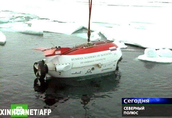 资料图片:这张2007年8月2日拍摄的电视截图画面显示俄罗斯科考队的深海潜水器。据俄罗斯媒体报道,俄罗斯科考队员当日乘深海潜水器从北极极点下潜至4000多米深的北冰洋洋底,在洋底插上了一面钛合金制造的俄罗斯国旗。 新华社/法新