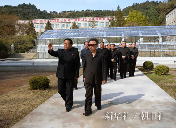 资料图片 这张朝鲜中央通讯社4月27日提供的照片显示,朝鲜最高领导人金正日(前右)近日在视察元山农业大学新建成的温室。金正日近日在视察元山农业大学新建成的温室时说,大学既要培养有实力的科技人才,也要加强科研工作,多出科研成果。新华社/朝中社