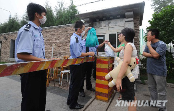 2009年7月30日 北京又一夏令营发生甲型H1N1流感疫情 目前确诊7人 7月30日,在华中园度假村隔离点,营员家长给隔离的孩子送衣物等用品。新华社记者 李文 摄