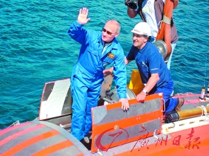 1日,他身穿蓝色保温服,乘潜艇在贝加尔湖中说:“这次潜水过程相当完美。”