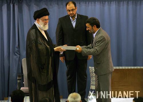 8月3日,在伊朗首都德黑兰,伊朗最高领袖哈梅内伊正式批准艾哈迈迪-内贾德为伊朗第10届总统。这是哈梅内伊(左)当天向艾哈迈迪-内贾德(右)颁发总统委任函。新华社发