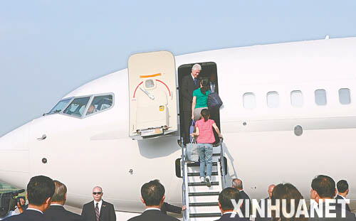 8月5日,被释放的两名美国女记者搭乘美国前总统克林顿的专机离开朝鲜首都平壤。 新华社记者 张滨阳摄