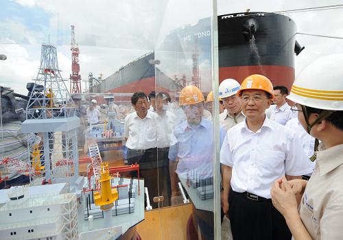 我国是世界造船大国,温家宝十分关心国际金融危机下船舶业的发展。在南通中远川崎船舶工程有限公司船坞里,技术工人们正在建造30万吨矿砂船。温家宝详细询问了造船技术发展以及定单情况。当得知企业生产了世界最先进的首座超深水海洋钻探储油平台时,温家宝表示赞许。他对工人们说,目前,外部经济环境不明朗,企业定单比较少。但是,世界经济前途总会有光明的一天,市场总还会活跃起来。我们要在产品结构上下工夫,根据市场需求调整技术方向,靠实力开拓新兴市场。中国造船业一定能够走在世界前列。