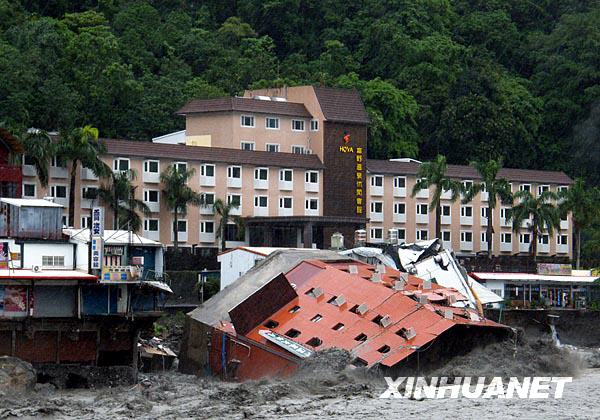 8月9日,在台东知本温泉区,6层楼高的金帅饭店被洪水冲倒。新华社发(吴景腾 摄)