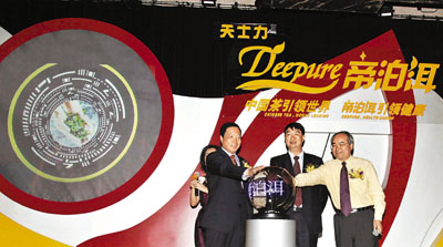 天士力集团董事长闫希军说,天士力将14年打造现代中药的技术、文化、思想等,融入到传统的普洱茶产业中,研究生产的“帝泊洱即溶普洱茶珍”,在普洱茶功效研究与开发领域取得了重大突破。他提出了大胆的目标:要与世界知名品牌“立顿”相竞争,让帝泊洱打造“科学普洱”成为茶理念创新的领跑者、茶产业技术的领跑者、茶产品标准的领跑者、茶功效创新的领跑者,让全球人都来享受中国茶源、茶文化及茶的先进技术。同时他表示,新品选择在国际化程度很高的香港上市,也就正式迈出了走向海内外市场脚步。