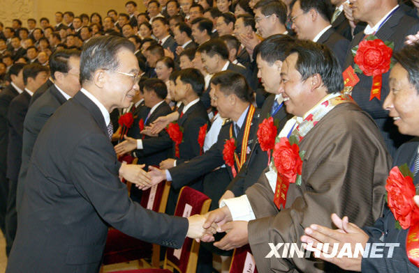 8月14日,第七届全国“人民满意的公务员”和“人民满意的公务员集体”表彰大会在北京举行。会前,中共中央政治局常委、国务院总理温家宝,中共中央政治局常委李长春,中共中央政治局常委、中央书记处书记、国家副主席习近平会见与会部分代表。新华社记者姚大伟摄
