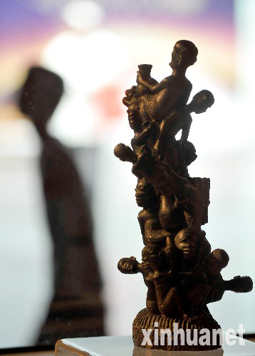 8月14日,一名观众从1984年7月由莫桑比克总统萨莫拉赠送给国务院副总理王震的礼物——乌木雕群像前走过。