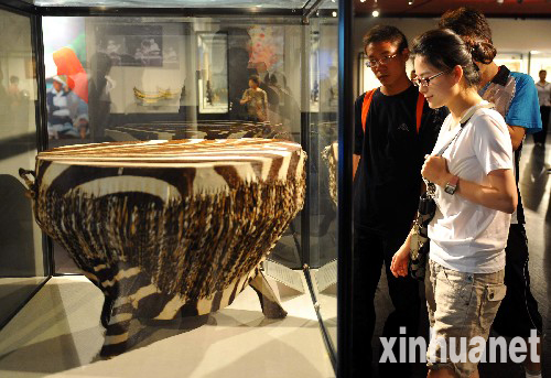 8月14日,一名观众在欣赏1974年3月坦桑尼亚总统尼雷尔赠予毛泽东的礼物——斑马皮鼓。