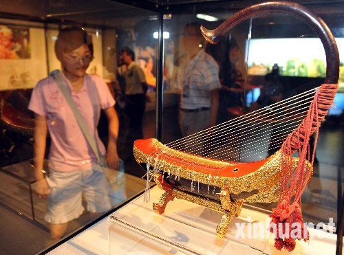 8月14日,观众在欣赏1971年缅甸贸易代表团团长貌伦赠国务院副总理李先念的金漆凤首箜篌。