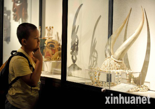 8月14日,一名小观众在欣赏1974年9月多哥总统埃亚德马赠送给毛泽东的礼品——贝镶羚羊角帽。
