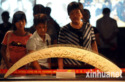 8月14日,一名观众在欣赏1988年7月由几内亚总统孔戴赠予国家主席杨尚昆的礼物——象牙双面浮雕村居动物图。