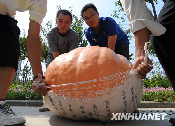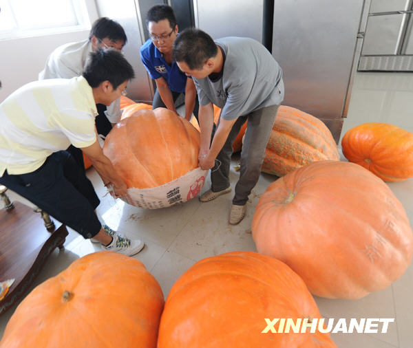 郑州市蔬菜研究所今年从国外引进南瓜新品种进行培育并取得累累硕果,其中个头最大的一个重量为252斤,“腰围”2.46米。据介绍,这种大型南瓜主要用于观赏。新华社记者 赵鹏 摄