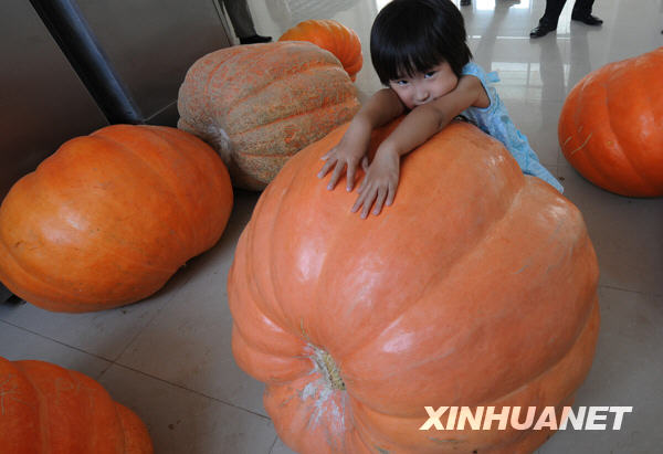 8月14日,一名小女孩趴在巨型南瓜上玩耍。新华社记者 赵鹏 摄 8月14日,郑州市蔬菜研究所的几名工作人员一起搬运从温室采摘下的巨型南瓜。 新华社记者 赵鹏 摄