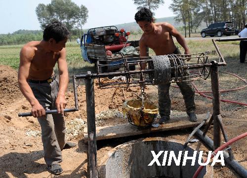 8月14日,在辽宁西北地区的阜新蒙古族自治县,当地农民自己动手打井,加快生产自救。 新华社记者 李钢 摄