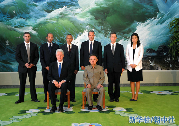 这张朝中社5日提供的照片显示的是朝鲜最高领导人金正日(前右)和美国前总统克林顿(前左)在平壤合影。据朝中社报道,朝鲜最高领导人金正日4日在平壤会见了来访的美国前总统克林顿。新华社/朝中社