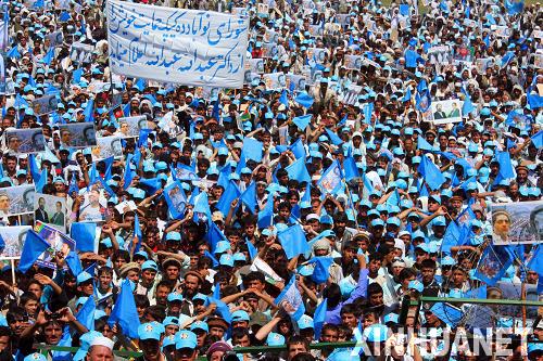8月17日,在阿富汗首都喀布尔,阿总统候选人、前外交部长阿卜杜拉·阿卜杜拉的支持者参加竞选集会。阿富汗将于8月20日举行总统选举。新华社发(扎比摄)