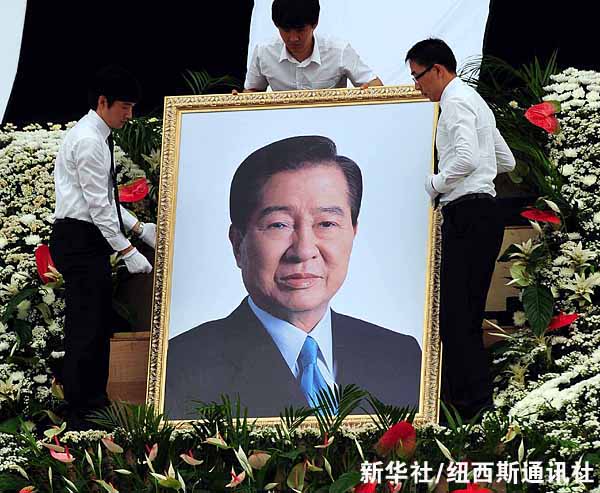 8月19日,在韩国首尔市,工作人员在首尔广场为前总统金大中设立灵堂,接受各界吊唁。金大中于18日在首尔市中心的塞弗伦斯医院去世,享年85岁。新华社/纽西斯通讯社