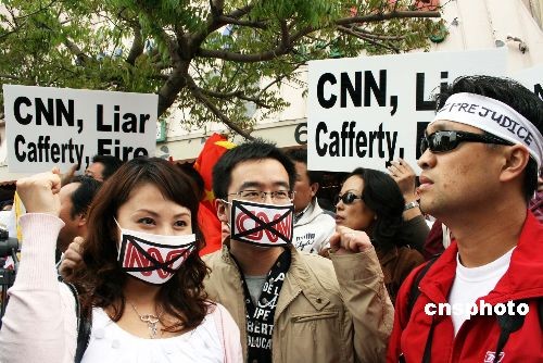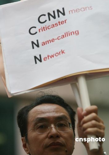 2008年四月二十三日,香港教育团体───教育评议会在CNN驻香港办事处外集会,抗议CNN电视主播辱华言论,要求CNN正式收回有关言论,并由最高负责人向全世界的中国人道歉。 中新社发 武仲林 摄