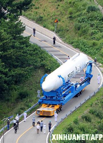 8月23日,在韩国罗老宇航中心,“罗老”号火箭被运往发射架。韩国将于本月25日再次在罗老宇航中心发射19日因软件故障中止发射的韩国首枚运载火箭“罗老”号。由于与俄方签署协议出现滞后等原因,“罗老”号的发射时间从2007年一推再推。 新华社/法新