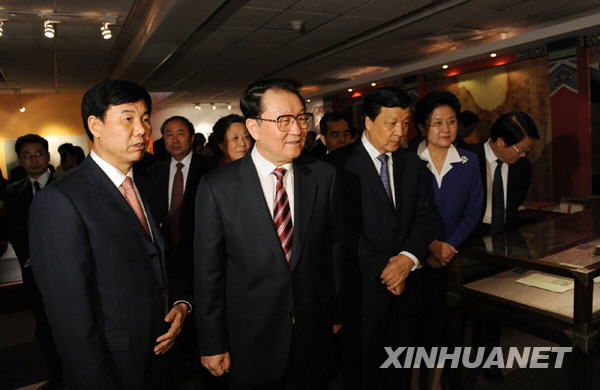 9月9日,国家图书馆建馆100周年庆祝大会在北京举行。中共中央政治局常委李长春出席并讲话。这是庆祝大会后,李长春参观国家图书馆馆史展。新华社记者 黄敬文 摄