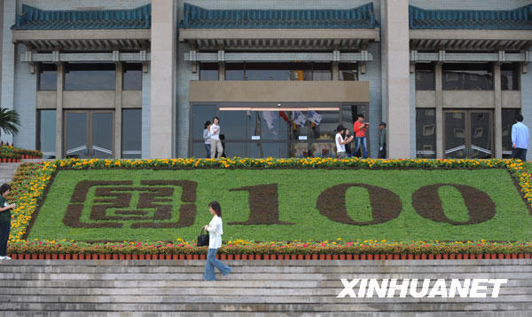 9月9日,市民从北京国家图书馆百年纪念花坛前走过。