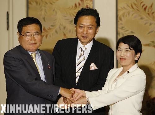 9月9日,日本民主党代表(即党首)鸠山由纪夫(中)、社民党党首福岛瑞穗(右)和国民新党代表龟井静香在日本首都东京握手。当天,在日本众议院大选中获胜的民主党与社民党和国民新党就三党联合执政达成了协议。