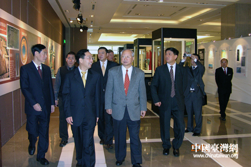 2006年12月14日,“首届天府之国—巴蜀文化精品展”在台北开展。图为黄小祥副省长、省台办主任刘俊杰在台湾新光三越董事长吴东兴陪同下参观展场(资料图片)