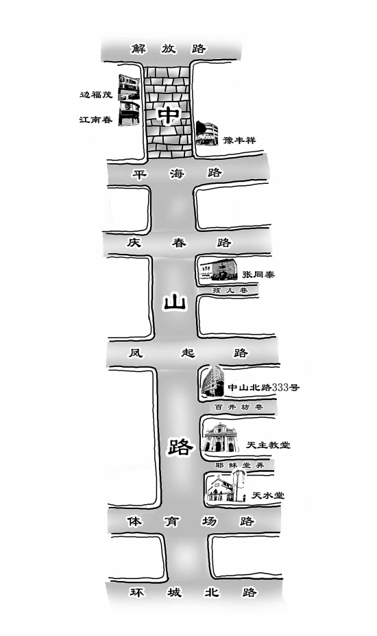就如今天要走的解放路至环城北路的这段中山路,历史建筑的踪影已所剩无几了,有的是边福茂、豫丰祥、江南春这样的老字号。它们刚从中山路的旧址搬迁过来,正在逐渐适应这里的气息。当然,孩儿巷口保留至今的张同泰,依旧人来人往。再往北,天主教堂、天水堂也有了新景象。最新潮的,要数中山北路旧式办公楼改装的动漫酒店。