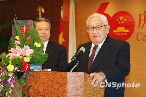 中国驻纽约总领馆十七日举行国庆招待会,与来自中美两国的政商界人士共庆新中国六十华诞。见证了中美关系发展三十年的美国前国务卿亨利·基辛格也到场与众人愉快交流,基辛格说:当七十年代第一次到中国时,我绝对想象不到中国有今天的发展成就。