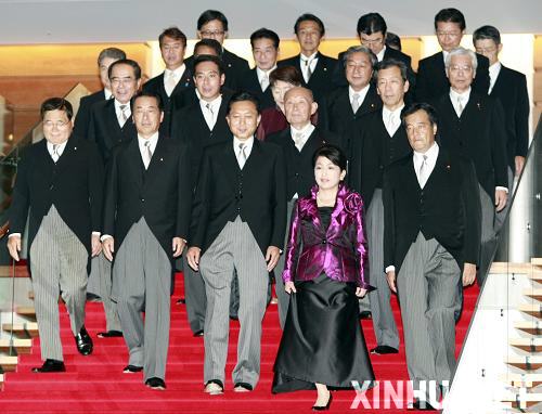 9月16日, 在东京首相官邸,新任日本首相鸠山由纪夫(前中)率内阁成员在媒体前集体亮相。当日,鸠山由纪夫经国会众参两院首相指名选举当选为日本新一任首相,并组建新内阁。 新华社记者任正来摄