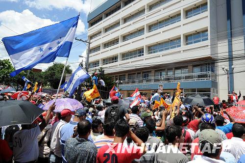 数千名塞拉亚支持者聚集在联合国驻洪办公室门前,迎接被罢免的总统归来。