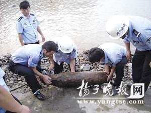 24日傍晚,镇江大港港区的江边发现一颗巨大的“炮弹”,经排爆专家现场勘查,确定这是侵华日军当年投下的航空炸弹。据知情者介绍,这颗炸弹是有人用巨大磁铁在江中“淘宝”淘上来遗弃在岸边的。
