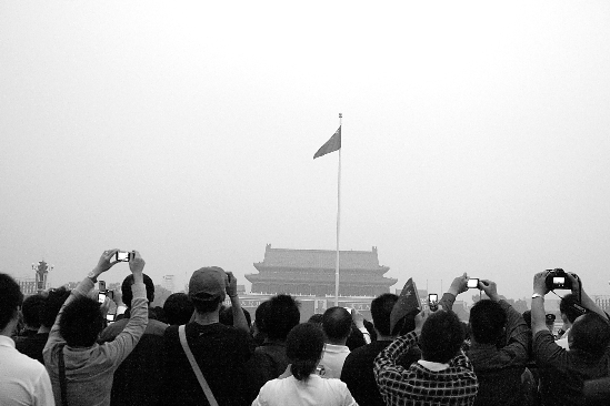 晨曦微露,昨天北京的清晨笼罩在一片薄雾之中。雾气遮挡不住观旗人群的热情,5点半,天安门广场上的旗杆旁已是人头攒动。6时,在人们期待已久的目光注视下,国旗护卫队走出天安门,踏上金水桥,穿过长安街。顿时,全场一片肃穆。人们踮起脚尖、翘首瞩望。