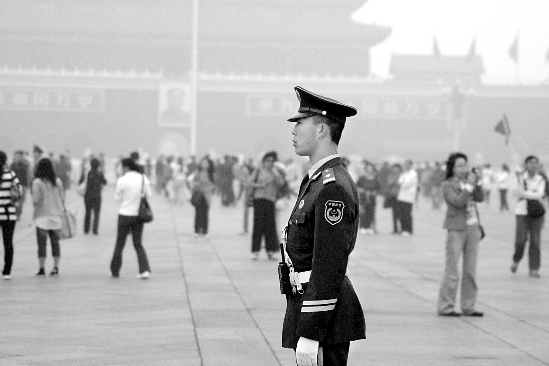 7点50分,天安门广场上游人如织,公安武警坚守在各自岗位上。