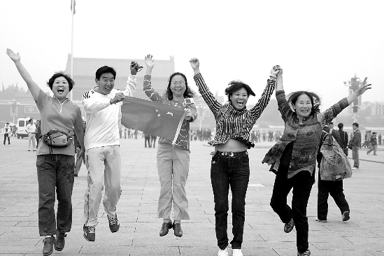 上午11点,北京的一群退休老人在天安门广场上欢呼雀跃。