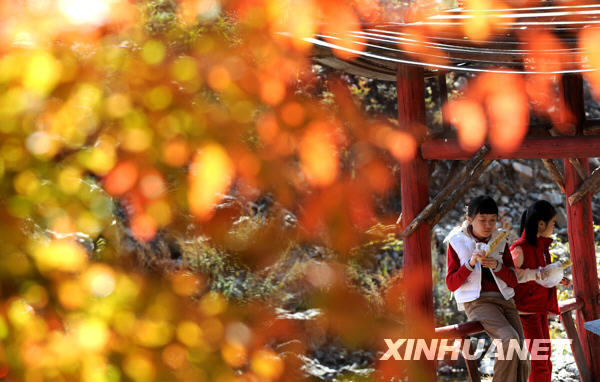10月6日,游人在辽宁本溪欣赏秋色。新华社记者 李钢摄