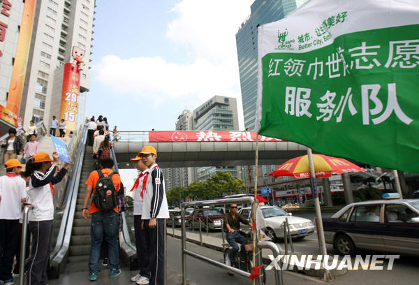 10月11日,上海红领巾世博志愿服务队的小队员在徐家汇地区进行交通引导、文明出行的宣传服务。在上海世博会倒计时200天即将来临之际,上海红领巾世博志愿服务队突破1000支。红领巾世博志愿服务队是面向上海全市少先队员招募的世博志愿服务队伍。“红领巾”志愿者们以小队形式走进社区,开展形式多样的世博志愿服务活动,充分发挥少年儿童在推进城市文明进程中“小手牵大手”的独特作用。新华社记者刘颖摄