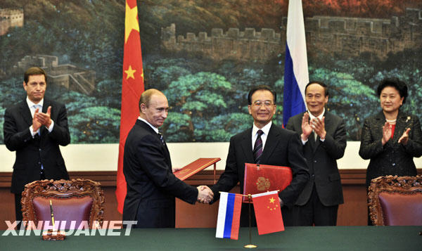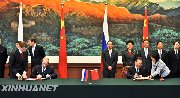 10月13日,国务院总理温家宝与俄罗斯总理普京在北京人民大会堂签署《中俄总理第十四次定期会晤联合公报》。新华社记者谢环驰摄